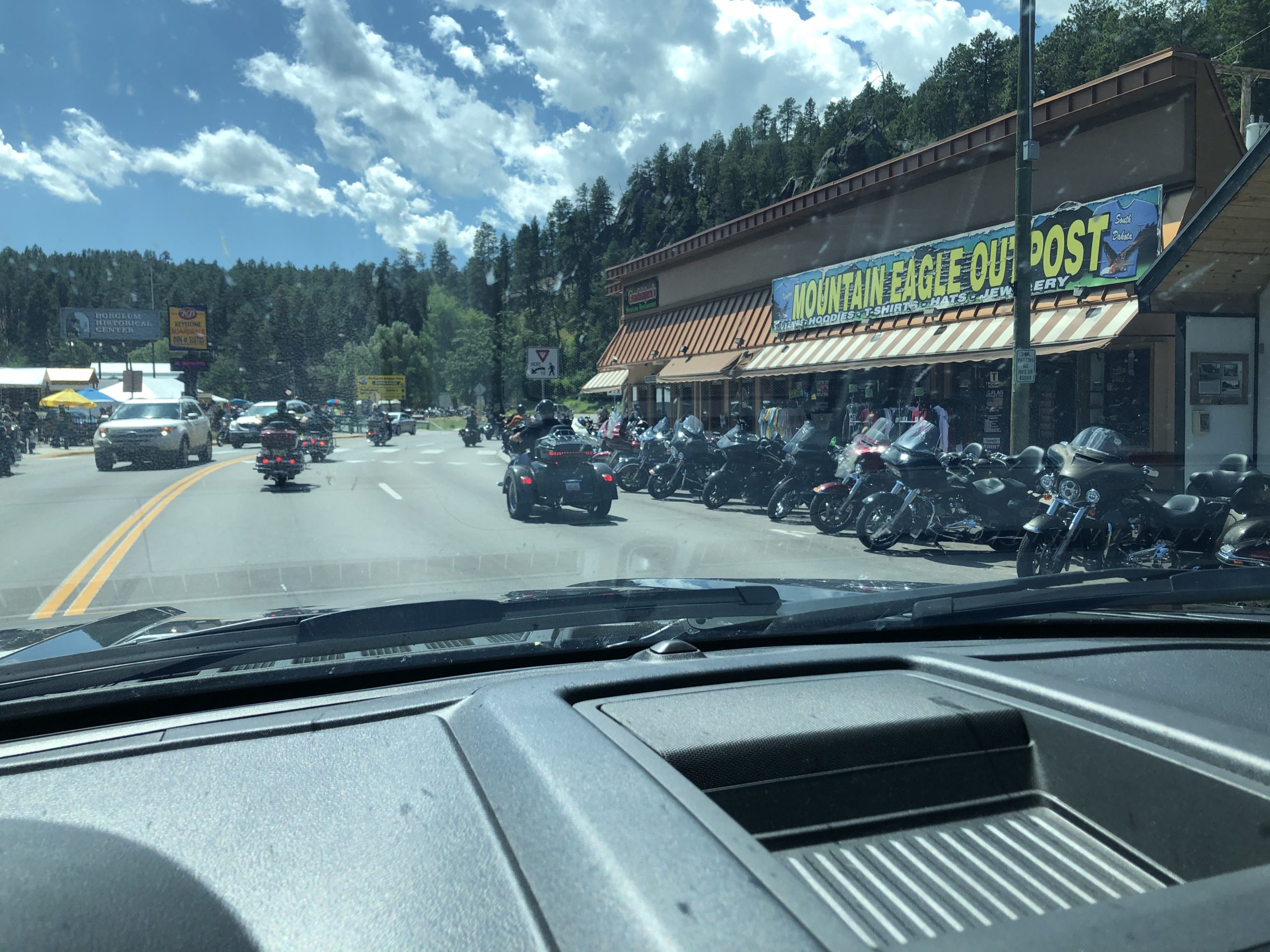 The trip across South Dakota was amazing. Crossing the Missouri River, oceans of grassland, miles of sunflowers, the badlands, and finally the black hills. The only issue I ran into was the wind, it was really windy coming across the grasslands. The motorcycles were leaning into the cross wind so it looked like they were going to tip over half the time.